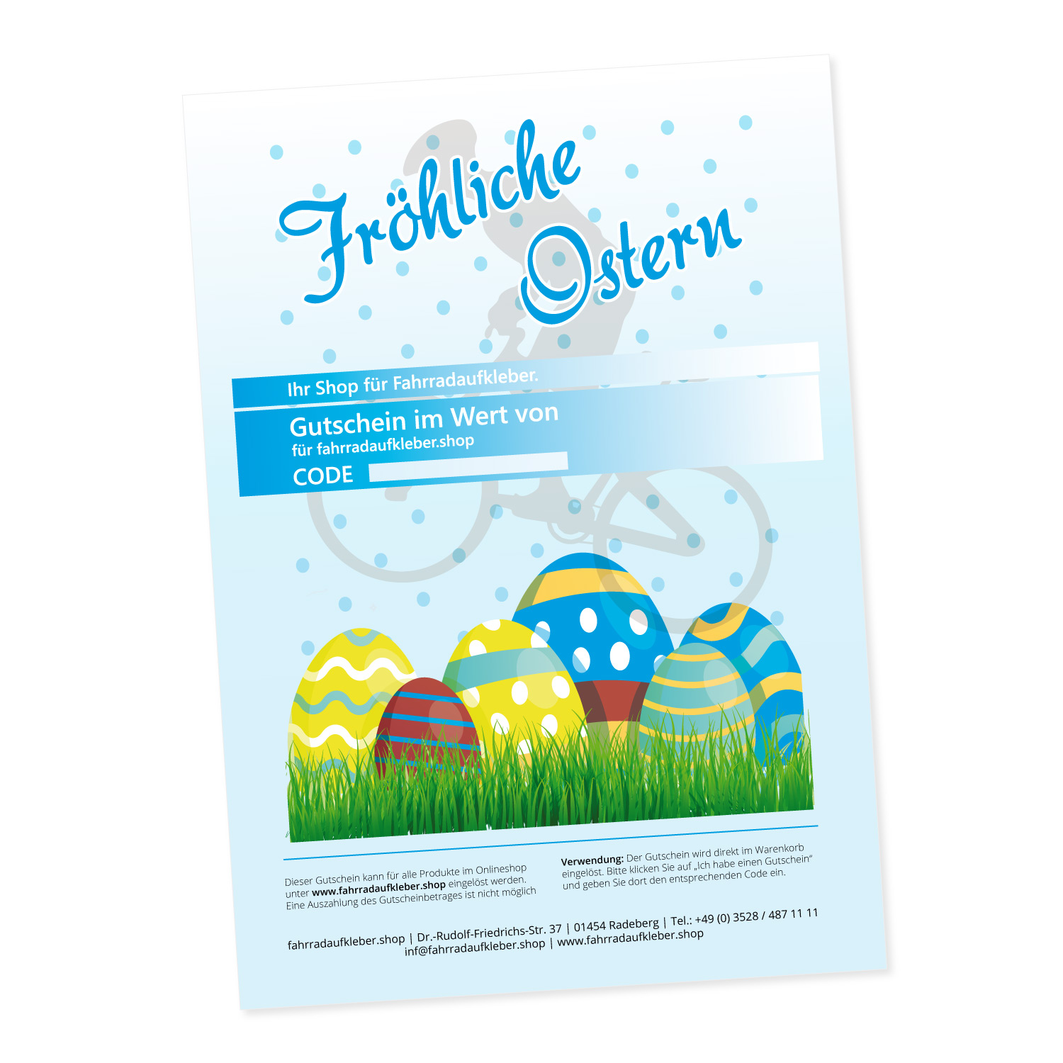 Verschenken Sie einen Gutschein für unseren Onlineshop und machen Sie Ihre Familie, Verwandte oder Bekannte glücklich. Unsere Gutscheine sind in verschiedenen Preisklassen erhältlich und können sofort nach Bestellung und Bezahlung gedownloaded werden. Anschließend können Sie sich den Gutschein farbig ausdrucken und tragen nur noch den Wert und den Gutscheincode ein.